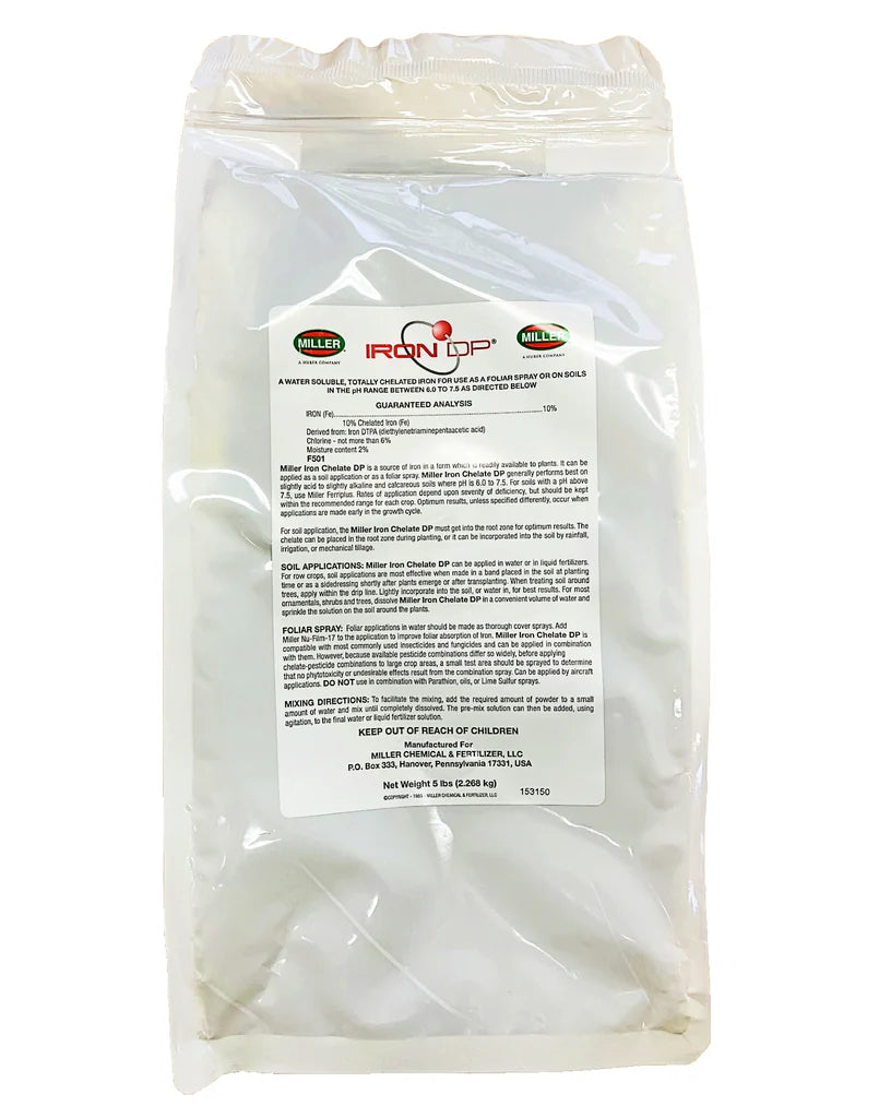 Miller Iron Chelate DP is a source of iron in a form which is readily available to plants. It can be applied as a soil application or as a foliar spray. Miller Iron Chelate DP generally performs best on slightly acid to slightly alkaline and calcareous soils where pH is 6.0 to 7.5. For soils with a pH above 7.5, use Miller Ferriplus. Rates of application depend upon severity of deficiency, but should be kept within the recommended range for each crop. Optimum results, unless specified differently, occur when applications are made early in the growth cycle.