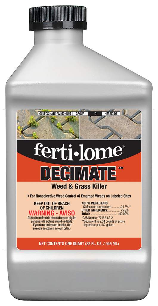DECIMATE Weed & Grass Killer is a non-selective herbicide that kills weeds, grass plus some woody plants. This is a contact, semi-translocating herbicide that inhibits glutamine synthetase. Works in 24 to 72 hours and works best when temps are over 85°. Rainfast in ½ hour to 4 hours. May be reseeded or replanted after the spray has dried.